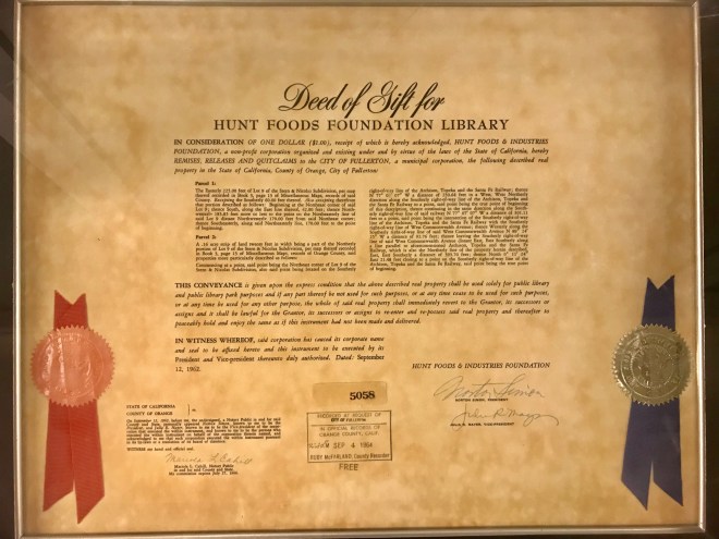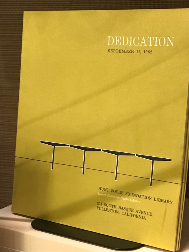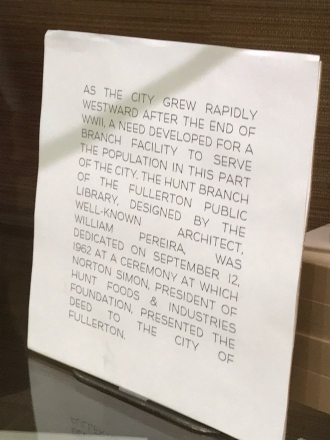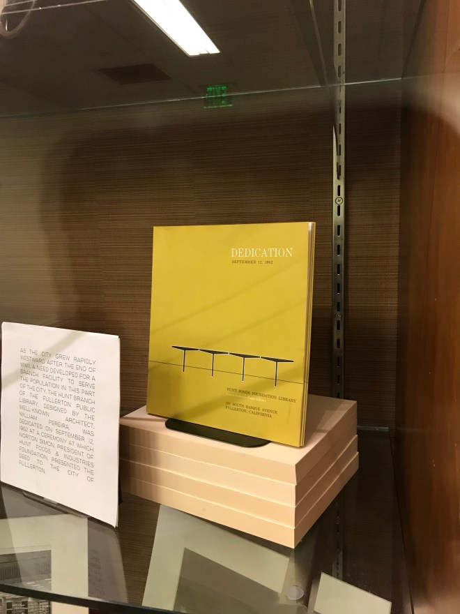 Right now the Main Branch of the Fullerton Public Library has a very nice exhibition of documents, photographs, and publications detailing the history of the various Fullerton Public Library facilities over the last century. Included are several artifacts celebrating the opening of the Hunt Branch in September, 1962…